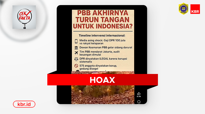 Beredar video di Facebook yang mengeklaim PBB turun tangan terhadap Indonesia dengan membuat “timeline intervensi internasional” terkait DPR. Pada narasi itu disebut Dewan Keamanan PBB menggelar sidang darurat hingga menyatakan DPR ilegal. Video yang sama juga diunggah di YouTube Shorts disertai narasi :