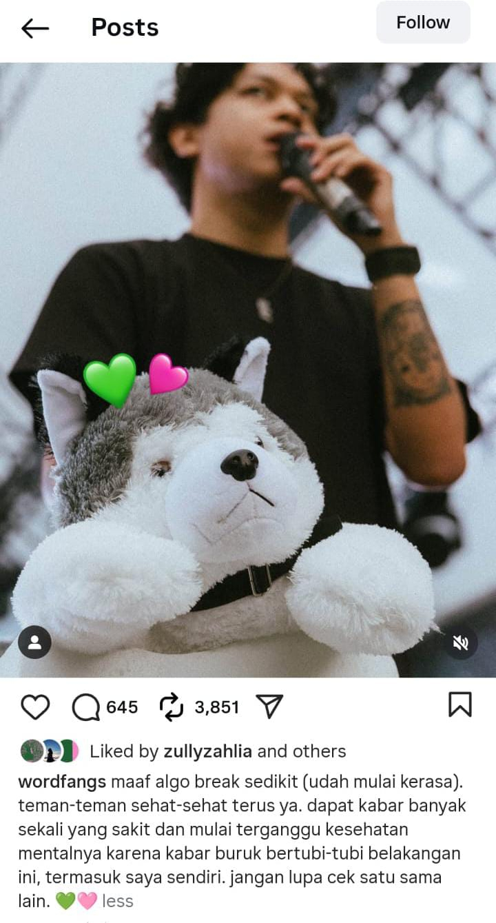 Penyanyi Daniel Baskara Putra atau yang akrab dikenal Hindia, salah satunya. Melalui akun Instagram-nya @wordfangs, Hindia bilang ingin jeda sebentar dari medsos karena mentalnya mulai terganggu. Banyak kawannya juga mengalami hal serupa, katanya.