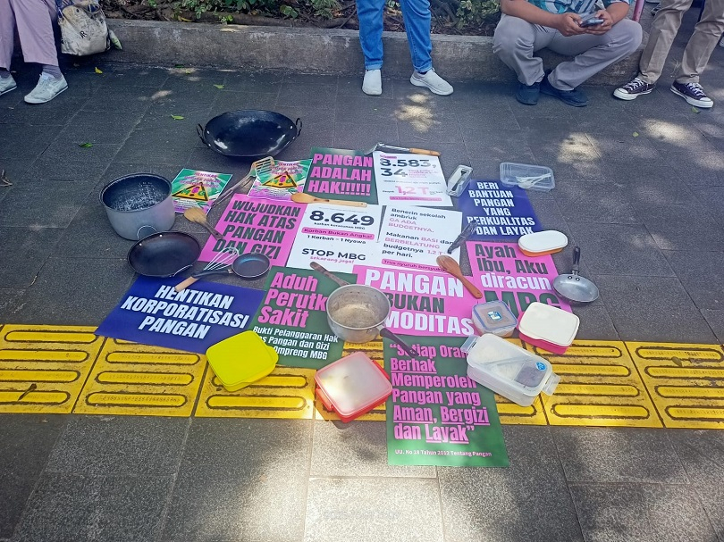 Mereka menyuarakan penolakan terhadap program MBG yang dinilai bermasalah dengan membawa panci dan alat dapur sebagai simbol protes serta bekal bergizi sebagai contoh standar yang seharusnya diberikan untuk anak-anak.